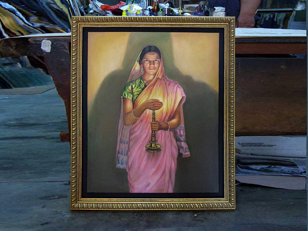 THICK OR MEDIUM SIZE FRAME WITH GAP BORDER- This type of canvas paintings stretching and framing will not touch the stretched oil painting, it will have a gap border between the frame and painting. It will give a floating effect on the painting and frame. The frame profile is also recommended this style of framing. The thick frame will give a very nice rich look for the painting. The gap border between the painting and frame gives a separation, the painting will have protruding look. There are more than 300 types or designed frame available for this style of framing.