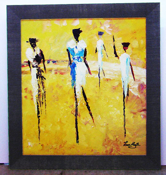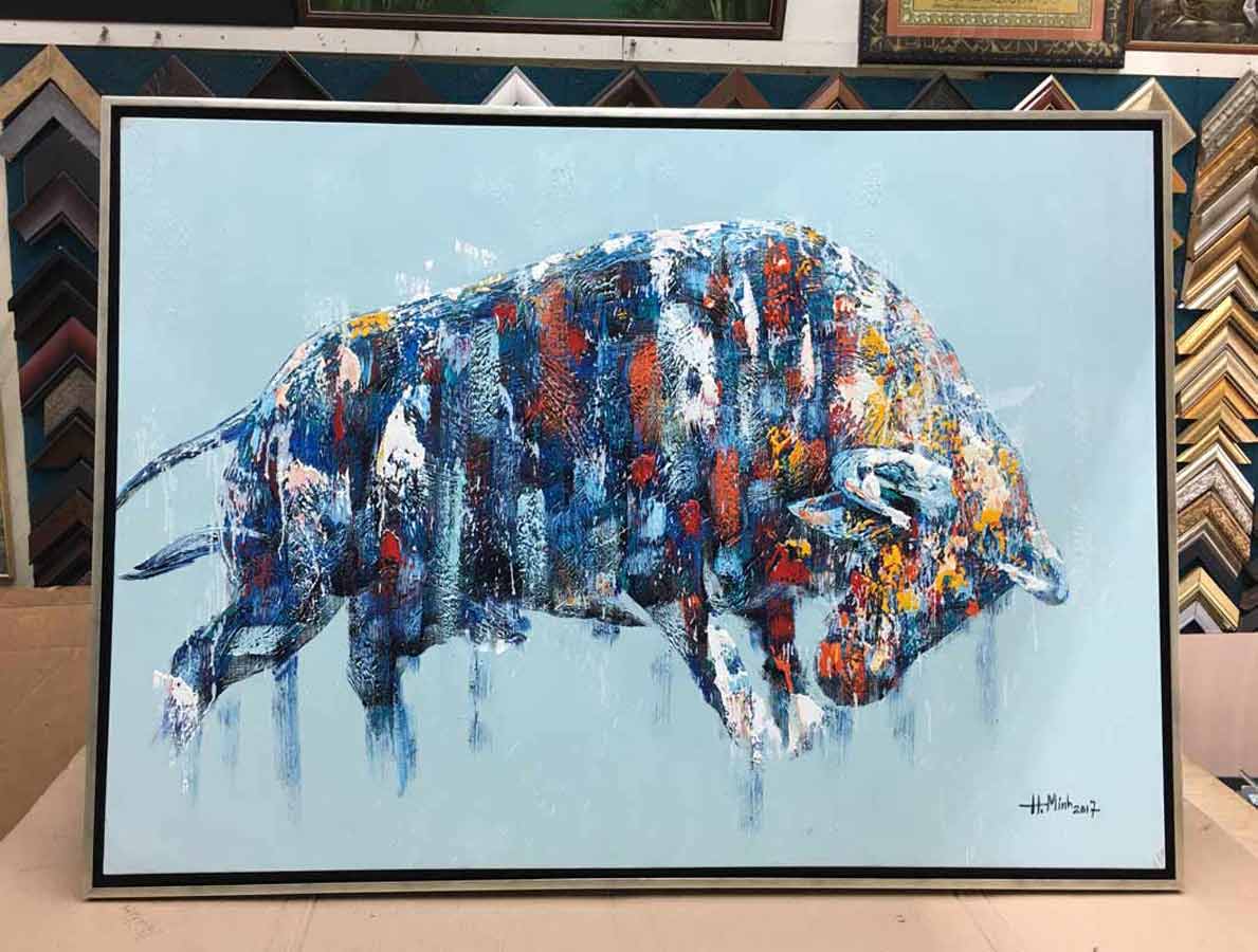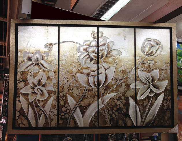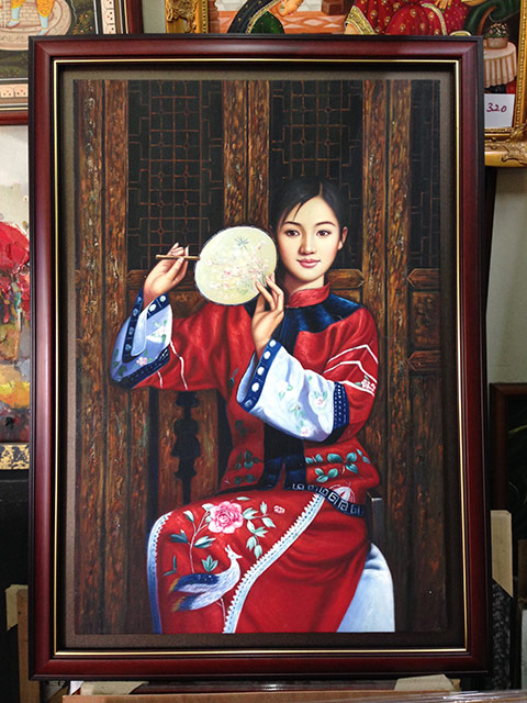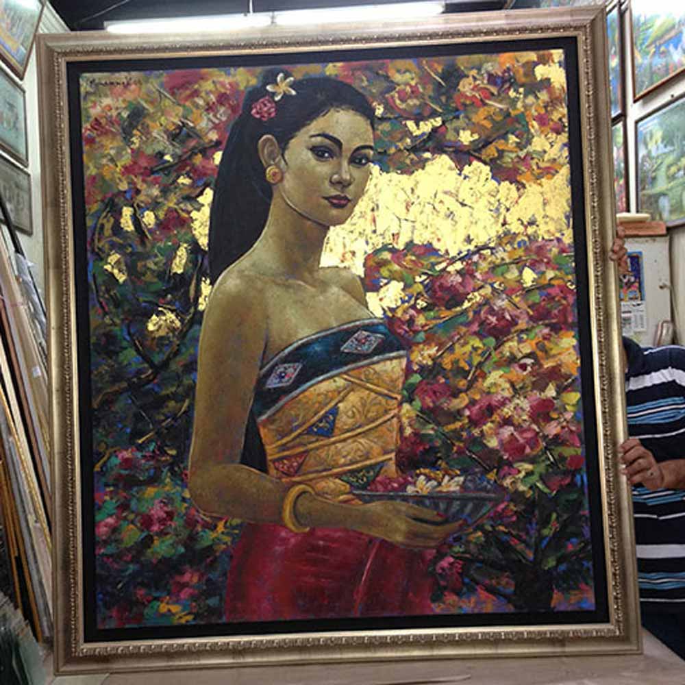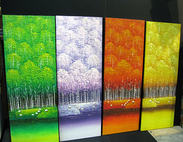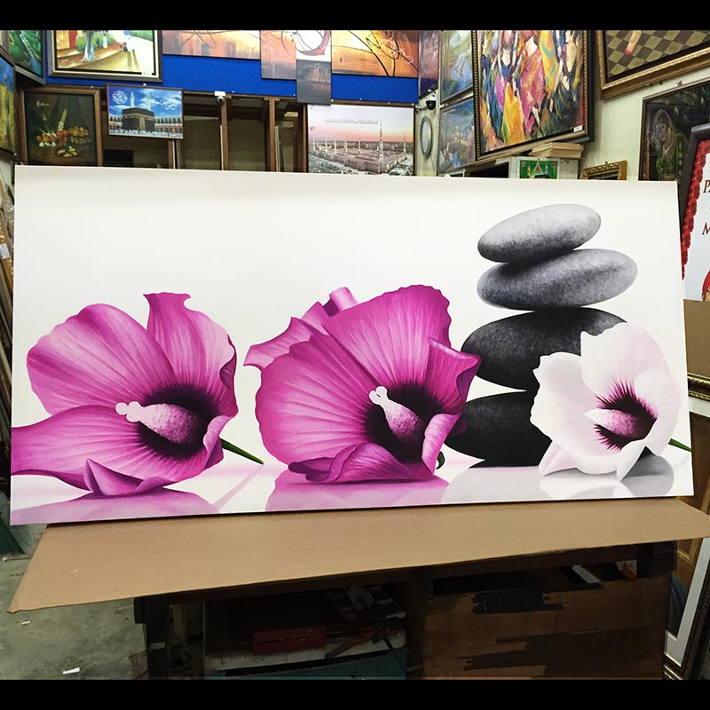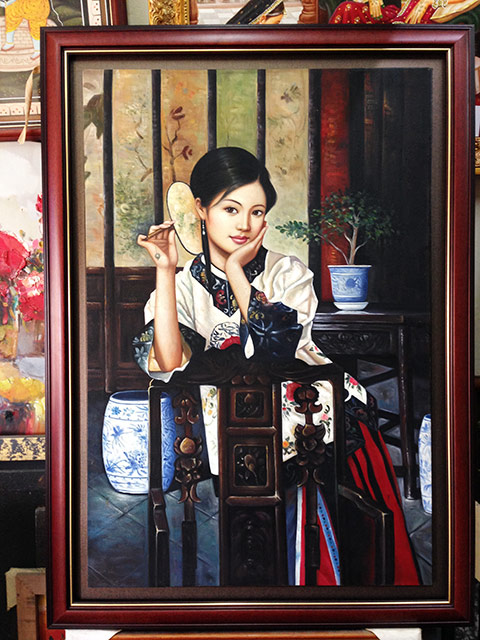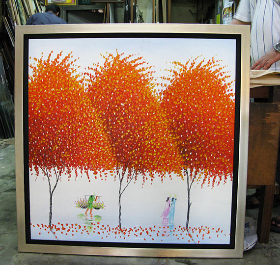 Canvas oil paintings can be framed in many ways. It can be directly framed or it can be done with border. The border can be the colour to match the painting or it can be just black, to give floating separation look. The border can also be clear acrylic to give see-through-effect of the wall and the wall colour see as a border. Another different border is wood grain finished gap border, give a country look. The traditional way of giving border is canvas frame border, which is the beige colour with gold edge trimming or plane.