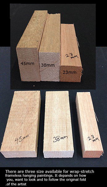 Tips for oil painting stretching: Oil painting wrap stretch is using a wood skeletal bar and painting is wrap stretch around to give frameless look to the painting and can hang. This mainly for modern art or group painting. It is the first step if you want it not frame first or if you decide you frame it later. It is no good keep valuable rolled and keep at home. Rolled painting crack easily if not stretched or framed, it needs ventilation. Wood bar height for stretching painting can 15mm, 24mm, 38mm or 45mm or even thicker, its depends on edge of the painting original fold of the artist or the way you want it to look boxy or slim look.